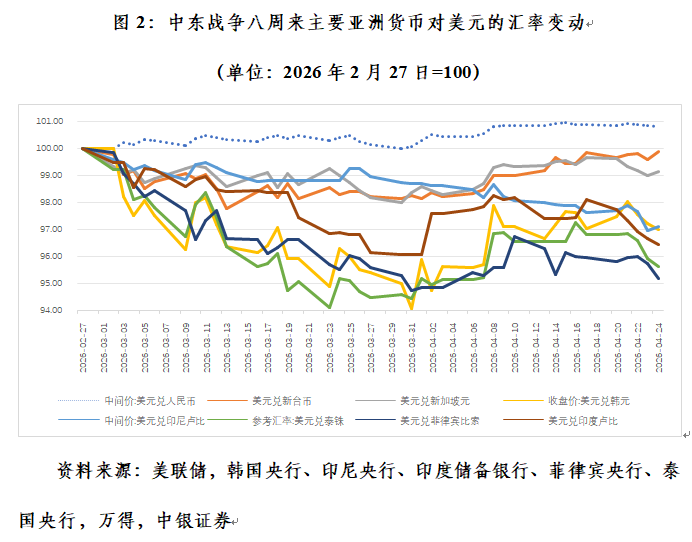 由于对能源进口尤其是中东地区能源进口的依赖度较高,能源危机令亚洲货币普遍承压。截至4月24日,中国新台币、新加坡元、韩国元、印尼盾、泰铢、菲律宾比索、印度卢比对美元最多分别下跌2.22%、2.02%、5.91%、3.06%、5.88%、5.25%、3.91%。到4月24日,随着美元指数见顶回落,前述七种亚洲货币汇率跌幅分别收敛至0.12%、0.86%、3.12%、2.89%、4.38%、4.81%、3.54%,人民币在亚洲货币中可谓一骑绝尘(见图2)。