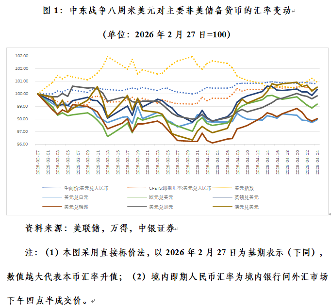 本次中东战争爆发后,美元指数一度最多升值2.93%。截至4月24日(均指当地时间,下同),在国际货币基金组织(IMF)披露币种构成的七种非美主要储备货币中,欧元、英镑、加元、澳大利亚元对美元汇率最多分别下跌3.38%、2.23%、2.16%、3.67%,传统避险货币——日元和瑞郎汇率最多分别下跌2.61%和3.90%;境内人民币汇率中间价对美元稳中趋升,最多上涨0.94%,境内人民币即期汇率(即境内银行间外汇市场下午四点半成交价,下同)最多下跌0.90%。4月份,美元指数震荡回落,到4月24日涨幅收敛至0.90%。同期,欧元、加元、日元、瑞郎汇率跌幅分别降至0.82%、0.18%、2.05%、1.99%,英镑、澳元汇率分别由跌转升0.34%、0.51%,人民币汇率中间价和境内即期汇率对美元分别升值0.81%、0.32%(见图1)。