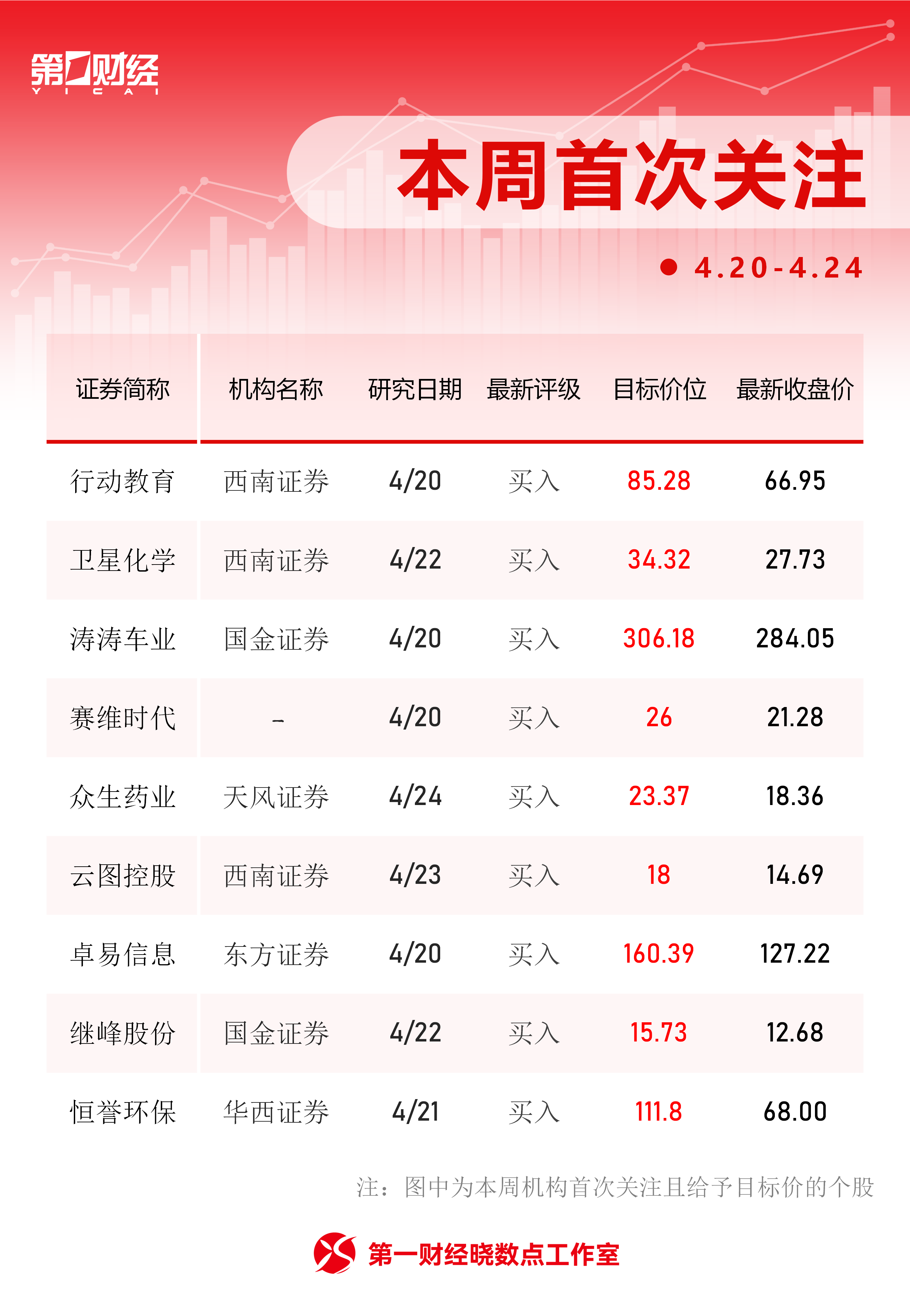 Wind数据显示,机构4月20日至4月24日首次关注106只个股,其中9股被给予目标价。