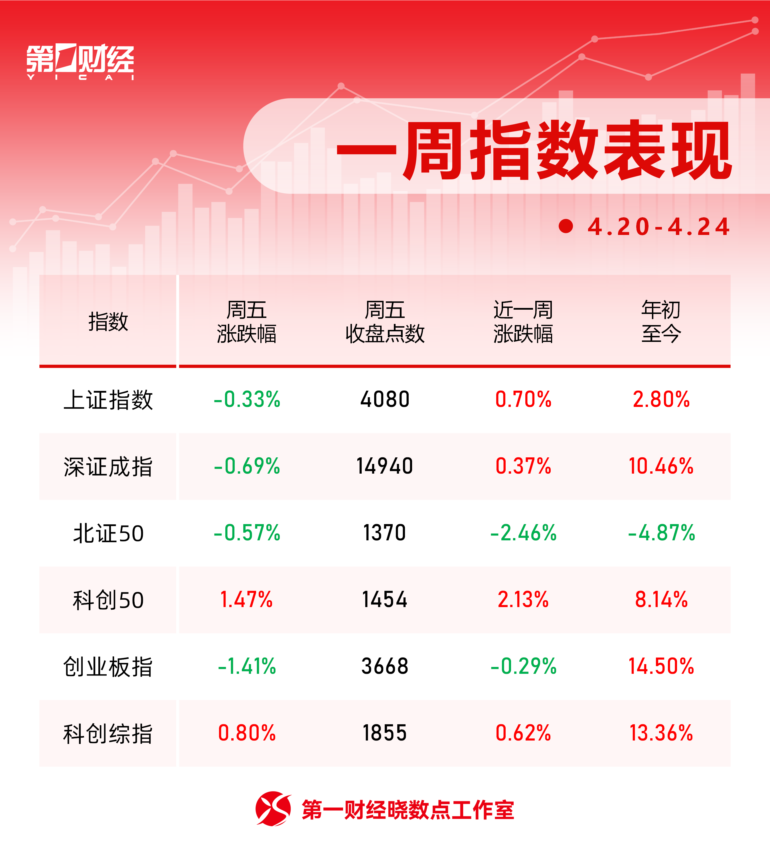 4月20日至4月24日,A股指数多数上涨,沪指累计涨0.7%,深成指涨0.37%,创业板指跌0.29%,科创综指涨0.62%。