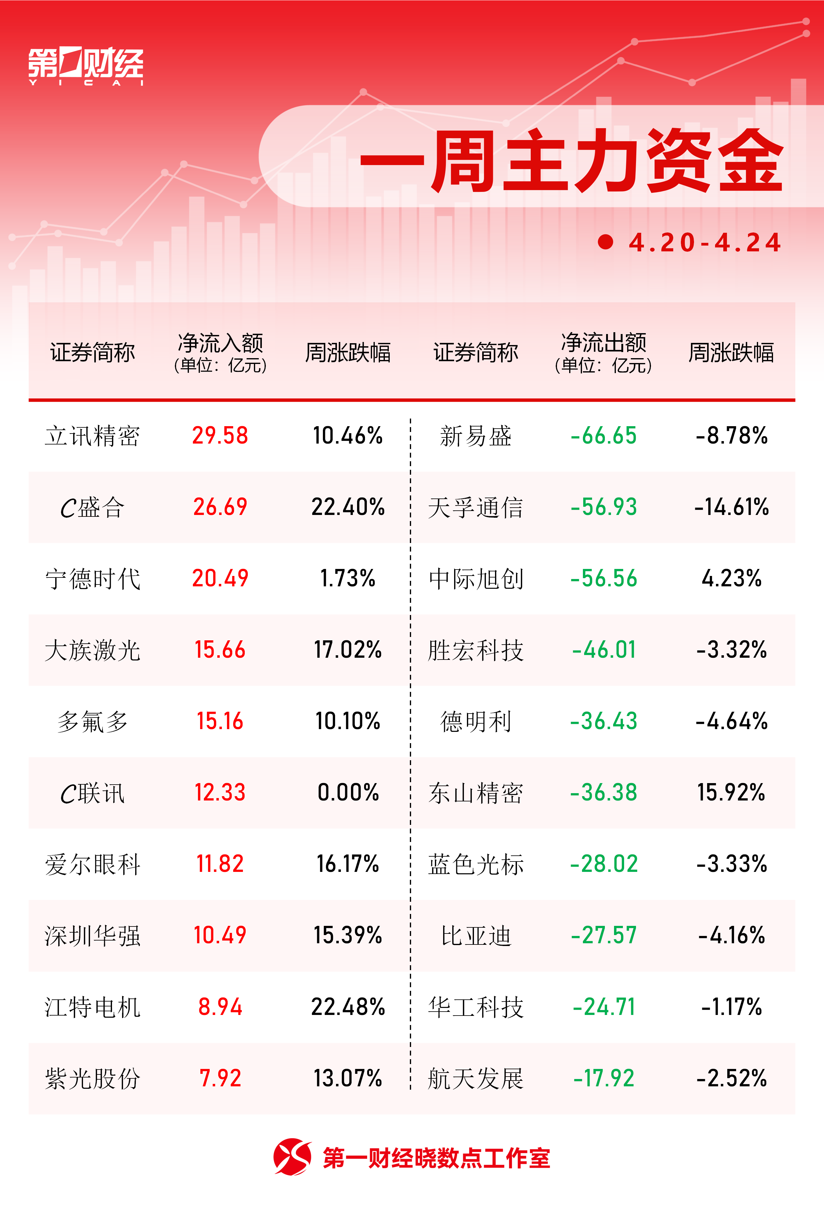 个股方面,立讯精密获净流入29.58亿元居首,周涨10.46%。C盛合、宁德时代主力净流入分别为26.69亿元、20.49亿元。净流出方面,新易盛、天孚通信、中际旭创分别遭抛售66.65亿元、56.93亿元、56.56亿元。