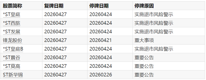 Wind数据显示,4月27日,*ST皇庭、*ST西旅、*ST发展等8只个股复牌。