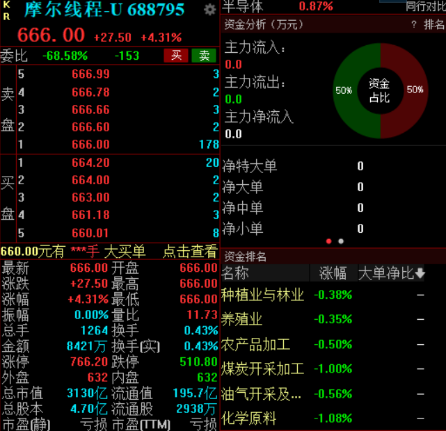 个股方面,摩尔线程高开超4%,公司2026年一季度业绩亮眼。根据公告,摩尔线程今年一季度营收7.38亿元,同比增长155.35%;归母净利润0.29亿元,扭亏为盈。