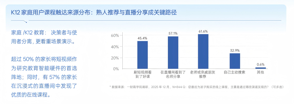需求侧的变化,同样推动着用户决策链路的重构。白皮书指出,教育用户的决策正在从“先搜索、再比较、后购买”的理性路径,转向以内容发现为起点的渐进式决策过程。在这一过程中,抖音等内容平台正逐步成为教育决策的核心入口。