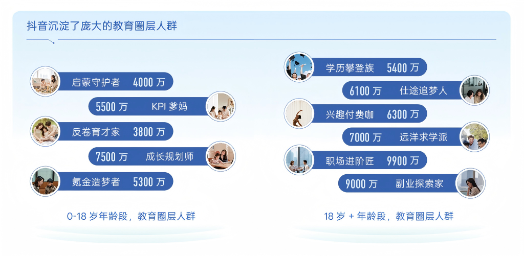 今天的教育市场正在演变出11大消费圈层,用户需求不再适合被统一叙事覆盖。抖音作为内容平台凭借着丰富的教育内容,积累了大量行业圈层人群。