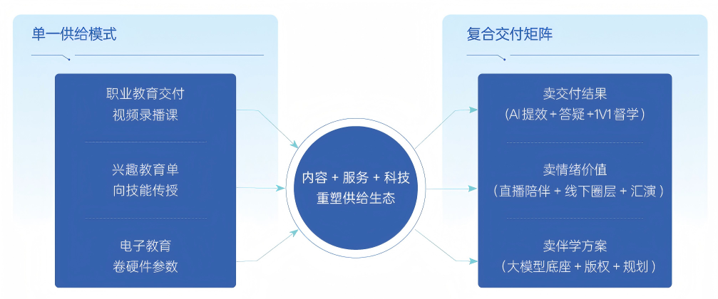 当教育需求从标准化走向高度个性化,供给方式也必然随之调整。白皮书显示,教育行业正在从以标准化课程为核心的单一供给模式,迈向“内容 + 服务 + 科技”深度融合的新供给阶段。在这一阶段,教育产品不再只是卖课程,而是围绕用户的学习目标与成长路径,提供更连续、更立体的学习支持。