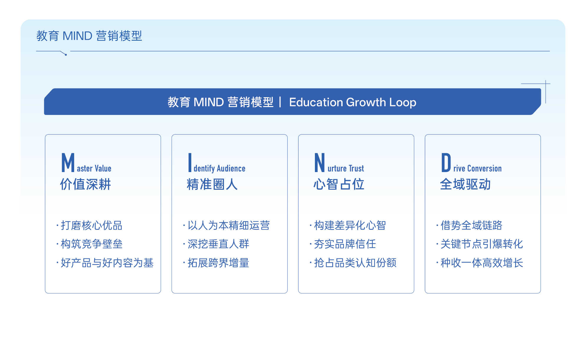 在这一背景下,白皮书提出了教育行业的MIND营销模型。这一模型立足全民学习时代下教育营销环境的变化,试图帮助教育品牌在更复杂的全域生态中,完成从流量思维到经营思维的升级。其核心不只是“怎么投放”,而是如何通过价值深耕(Master Value)、精准圈人(Identify Audience)、心智占位(Nurture Trust)、全域驱动(Drive Conversion)四个关键环节,建立从认知到转化、从流量到留量的完整增长闭环。
