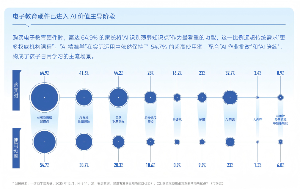 与此同时,技术能力开始更深地介入教育供给之中,从智能推荐、学习诊断,到内容匹配与进度追踪,科技正在成为支撑全新教育生态的底层基础设施。调研数据显示,在购买和实际使用中,教育电子产品中的AI功能正成为用户重点关注的核心要素。