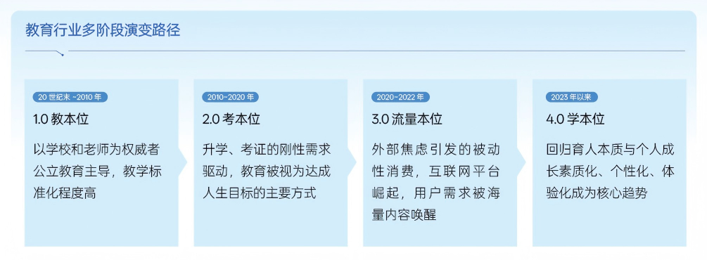 随着终身教育体系的持续演进与教育市场的不断扩容,教育行业的底层驱动力正在发生深刻转移——从过去的教本位、考本位和流量本位,全面迈向学本位时代。