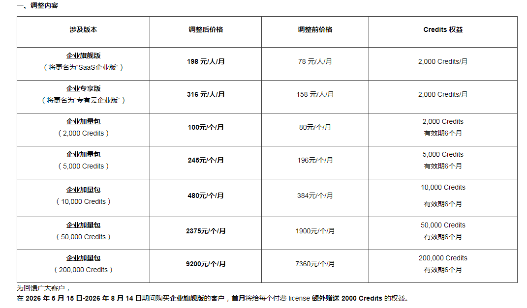 腾讯云发布关于CodeBuddy、WorkBuddy计费方案调整的公告,计划于2026年5月15日起执行新的计费方案。其中提出,企业旗舰版将更名为“SaaS企业版”,价格由“78元/人/月”调整为“198元/人/月”;企业专享版将更名为“专有云企业版”,价格由“158元/人/月”调整为“316元/人/月”。