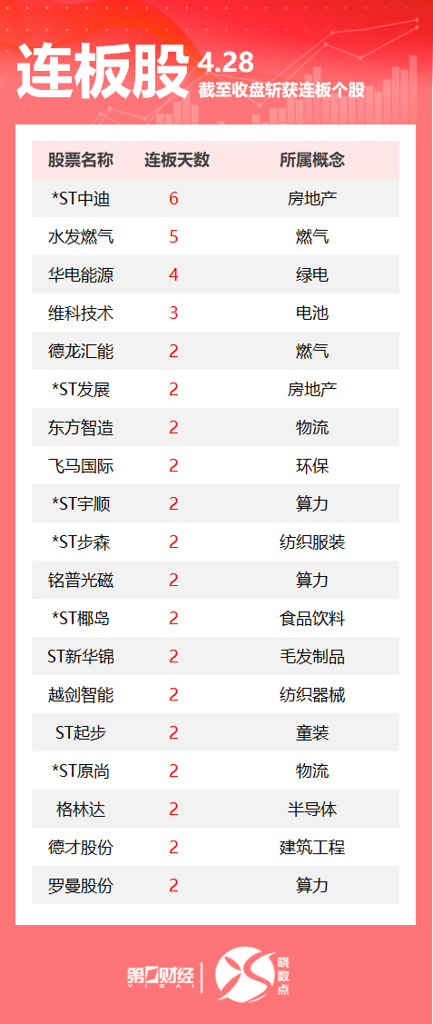 4月28日,Wind数据显示,A股市场共计77只个股涨停。其中燃气板块水发燃气5连板,绿电板块华电能源4连板。一图速览今日连板股>>