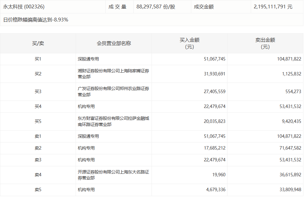 永太科技今日跌停,有3家机构专用席位净卖出1.14亿元