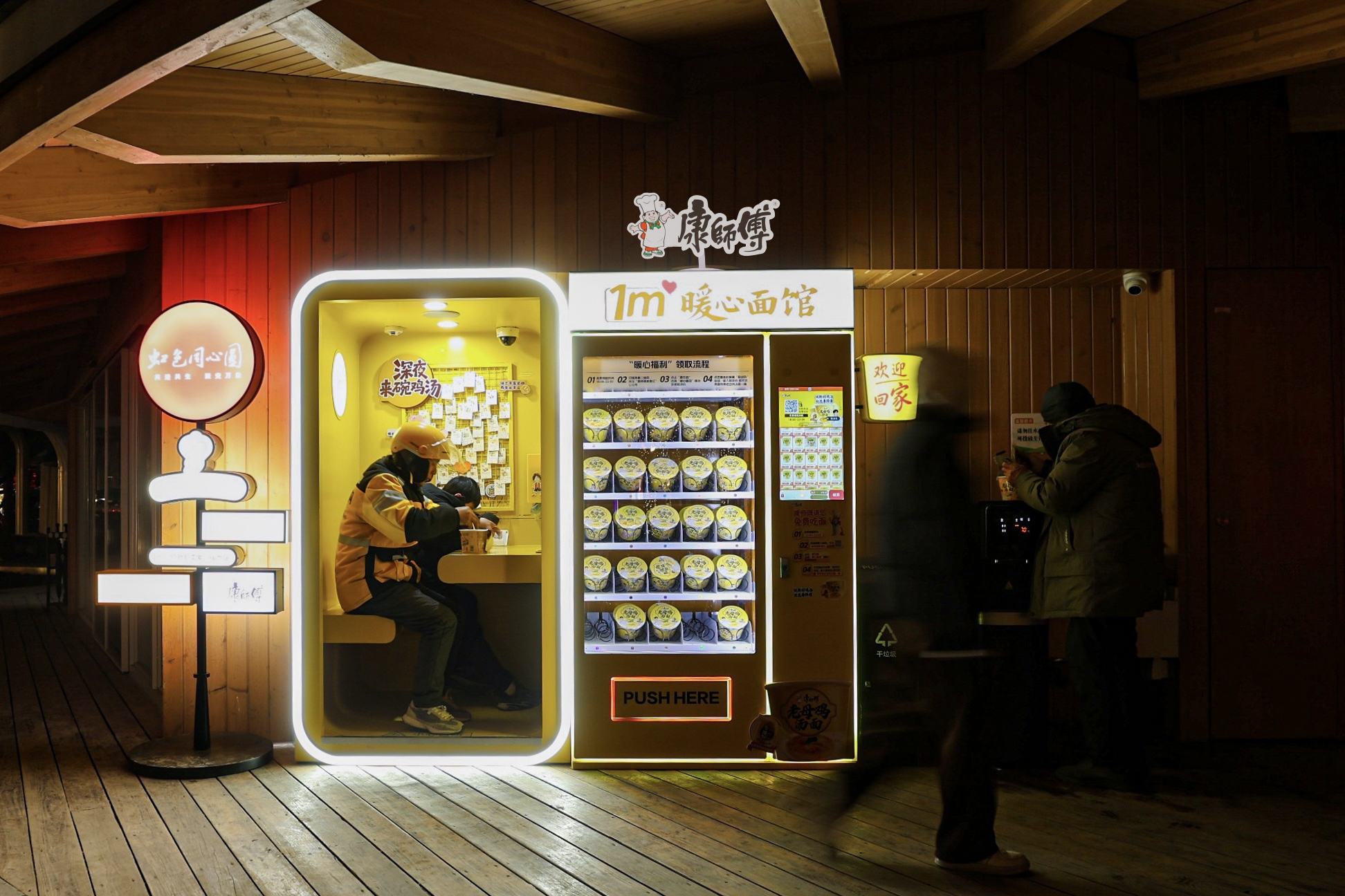 “1m²暖心面馆”公益项目始于2025年9月,最初多以快闪形式出现。2026年1月19日,康师傅携手上海虹桥镇综合党委、虹桥镇党群服务中心和上海万象城共同打造的政企合作项目——" 1m²暖心面馆",在上海万象城初心驿·党群服务中心正式揭牌启用。面馆聚焦外卖骑手、网约车司机等新就业群体"深夜补给难、休憩空间少"的痛点,每日晚间通过免费提供"热汤、暖食"的老母鸡汤面与休憩空间,精准回应新就业群体的饮食与情感需求,也填补了城市夜间服务空白。
