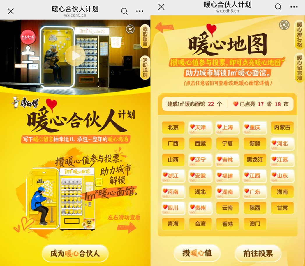 4月初上线后获得社会大众地积极参与,截至目前包含长期运营的暖心面馆项目在内,已经在暖心地图上点亮18个城市,落地22座暖心面馆。这份定制的温暖背后,是康师傅尝试带头在全国范围内探索一种“人人可参与、处处有温暖”的公益新模式,让给予不再是少数人的善举,而是全民共建共享的温暖事业,为人民共同期待的“暖心中国”添砖加瓦。