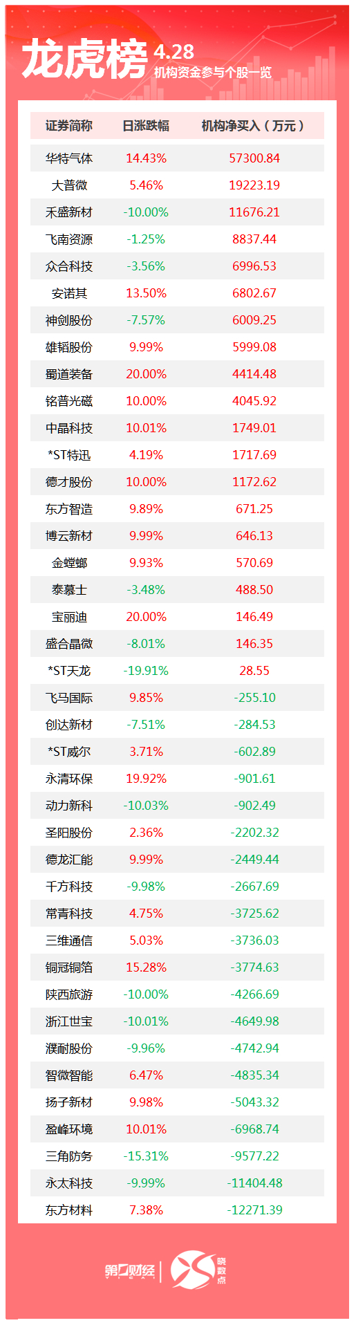盘后数据显示,4月28日龙虎榜中,共40只个股出现了机构的身影,有20只股票呈现机构净买入,20只股票呈现机构净卖出。