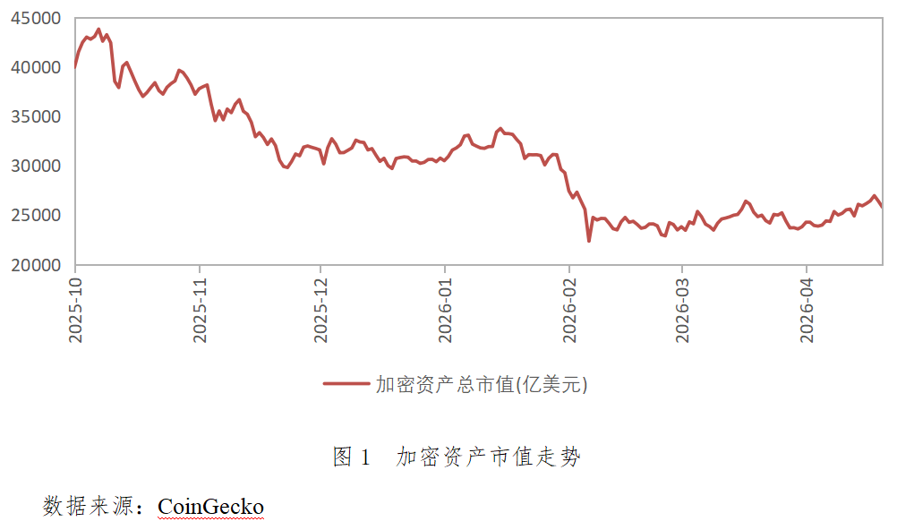 2026年第一季度,加密资产市值连续第二个季度下跌。根据CoinGecko的统计,截至4月20日,加密资产总市值约2.58万亿美元,较2025年四季度末的3.07万亿美元下跌16.14%。