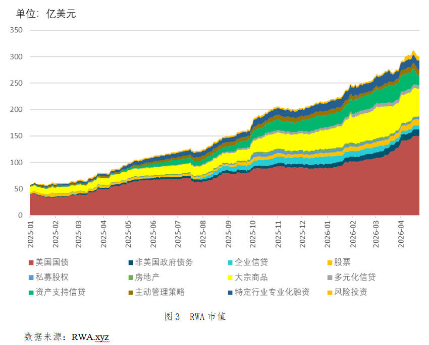 现实世界资产(RWA)显著增长。根据RWA.xyz统计,截至4月20日,RWA总市值达300.70亿美元,较一季度末的215.04亿美元增长39.83%。根据底层资产划分,美国国债RWA占比最高,为50.01%,市值约150.36亿美元;其次为大宗商品RWA,市值52.68亿美元,占比17.52%;各种信贷类RWA(企业信贷、多元化信贷、资产支持信贷等)共计市值33.31亿美元,总占比11.08%;其余底层资产及其RWA市值占比为:特定行业专业化融资5.43%、非美国政府债务4.21%、股票3.78%、主动管理策略3.50%、风险投资2.72%,其余房地产和私募股权RWA占比均不足1%。