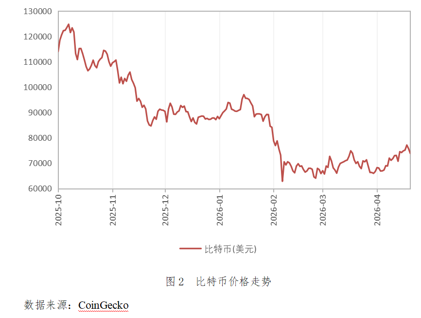 价格方面,一季度比特币价格与加密资产市值走势同步,二者相关性高达99.9%。根据CoinGecko的统计,截至4月20日,比特币收盘价为7.39万美元,较2025年四季度末的8.84万美元下跌16.47%。这一下跌主要发生在1月中旬至2月上旬,主要驱动因素是1月中旬以后,凯文·沃什可能被提名为下一任美联储主席的消息传出,其鹰派作风引发市场担忧。2月初AI的发展又引发了“SaaScosplayse”恐慌,美股软件股遭遇重挫,而加密资产被视为科技属性的风险资产,连带出现下跌行情,比特币2月6日录得全年最低收盘价62854美元。在本季度剩余时间内,比特币维持区间震荡,即便美国和以色列对伊朗的军事打击后,市场趋势依然未变。
