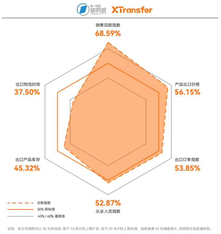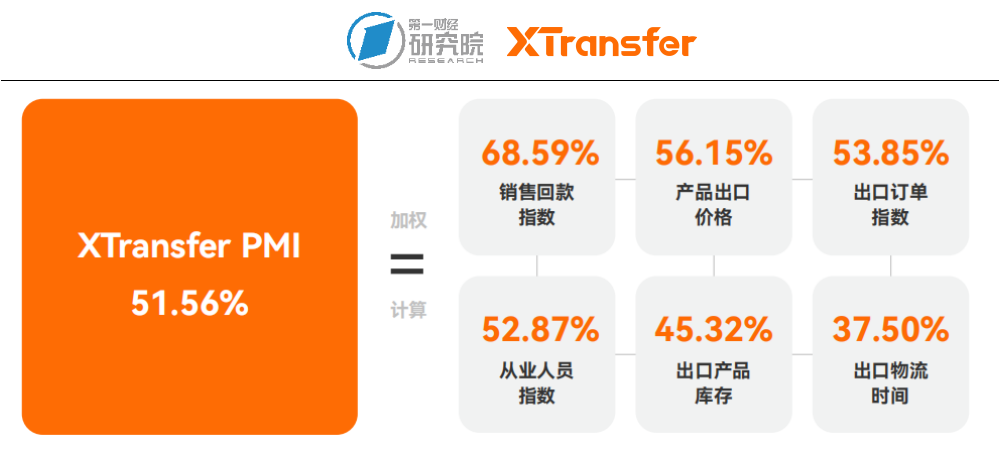 XTransfer PMI是由6个分类指数加权计算而成,6个分类指数及其权数是依据其贸易出口影响程度确定的,具体包括:出口订单指数、出口货物价格指数、出口物流效率指数、资金周转指数、货物采购指数、从业人员指数。