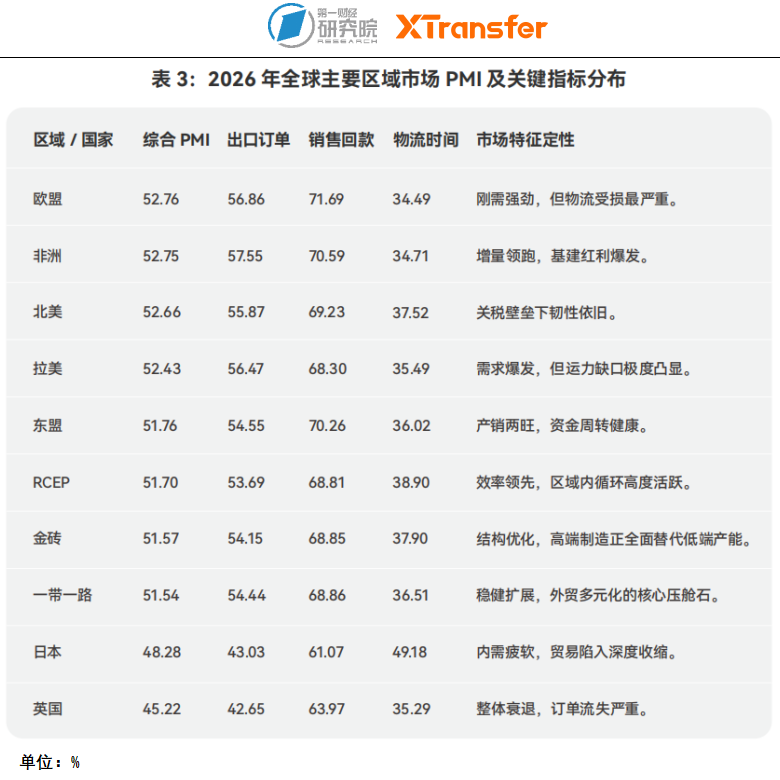 在所有监测区域中,RCEP成员国(PMI 51.70%)的数据表现最为均衡。最显著的优势在于物流的相对可控,其物流时间指数(38.90%)在收缩区间内表现出较强韧性,印证了近洋物流的高效与可靠。利用RCEP关税减免与原产地累积规则,企业应在此区域建立长期的“基本盘”客户群,利用稳定的物流与政策环境确保企业的日常现金流安全。