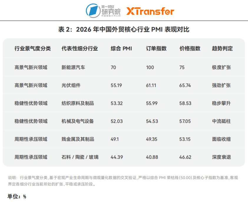 此外,杂项制品(PMI 52.49%)、鞋帽轻工(PMI 54.09%)均维持扩张,呈现订单与价格双稳的运行态势。部分传统行业的出口价格指数运行健康,表明海外市场对高质量产品的溢价接受度有所提升。中小企业应依托“小单快反”的快速响应生产模式,提升产品附加值,跳出同质化低价竞争陷阱。