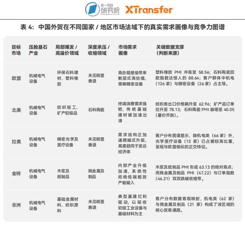 为了更精准地评估外贸竞争力,防止总平均值掩盖区域间的产业结构差异,调研进一步将“目标市场”与“输出产业”结合起来进行深度拆解。