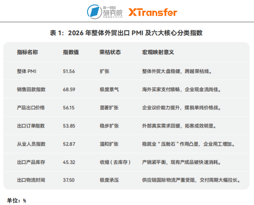 本期XTransfer PMI是基于双方对平台80万中小微外贸企业进行抽样调查,抽取了全国各地3000多家企业样本,分析维度包括出口订单、价格、采购、物流、人员、资金周转等,涉及到外贸出口的完整流程。报告显示,2026年3月XTransfer PMI指数为51.56%,表明中小微外贸企业出口形势基本向好,在复杂严峻的外部环境下保持韧性,在国际市场上的定价权稳步提升;同时,新兴市场需求结构重塑,出口重心向“中间品与高端化”转移。