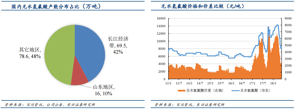 东兴证券指出,氢氟酸是由萤石与浓硫酸反应制得,利用无水氢氟酸来获取萤石中的“氟”几乎是氟化工产业链的必经上游路线,氢氟酸是生产制冷剂、含氟聚合物和含氟精细化工品的必备原料,在整个氟化工产业链中举足轻重。然而,极活泼的化学性质也决定氢氟酸具有较强的腐蚀性。作为高危化学品,环保高压迫使中小企业退出产能,副产废酸胀库压缩产量。氢氟酸是氟化工行业的咽喉要塞,作为高危化学品,氢氟酸规划进园困难,长江环保大整治以及青岛峰会合计有约50%的潜在产能可能受到影响。副产废酸难消化,中小企业胀库现象不断。本轮氢氟酸价差提升明显并有望维持高位。