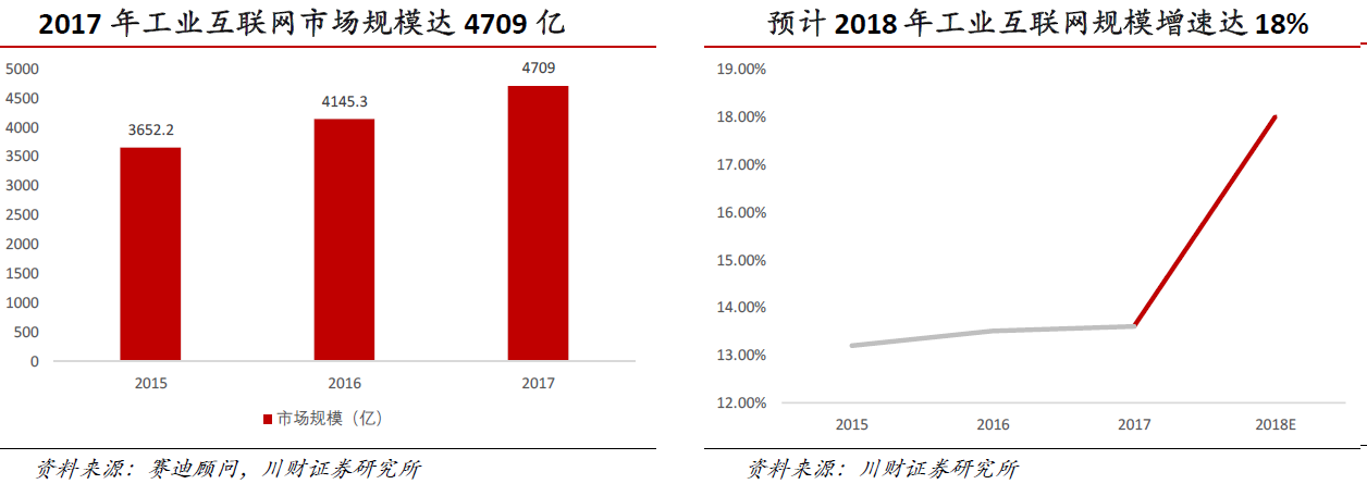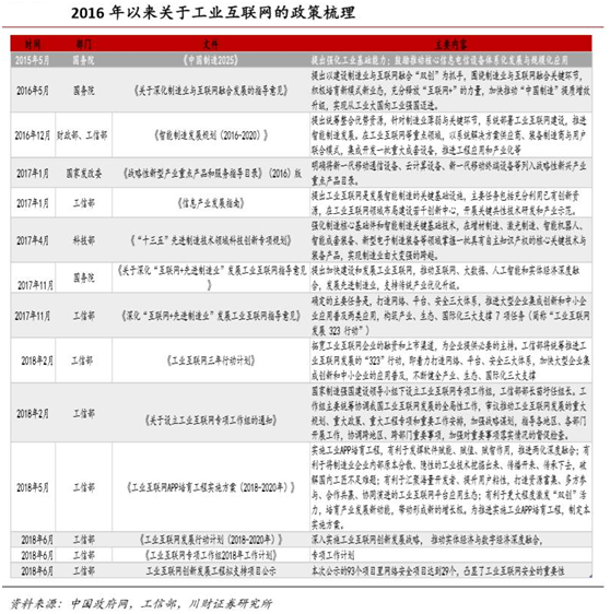 川财证券指出,2018年是工业互联网开局之年,市场空间广阔。2018年6月12日工信部信管局公示了2018年工业互联网创新发展工程拟支持项目名单,表明工业互联网发展的紧迫性以及管理部门的高执行力,工业互联网有望迎来加快发展。工业互联网从纸面的意见和政策开始转变为具体实施,标志着工业互联网进入了新的发展阶段。