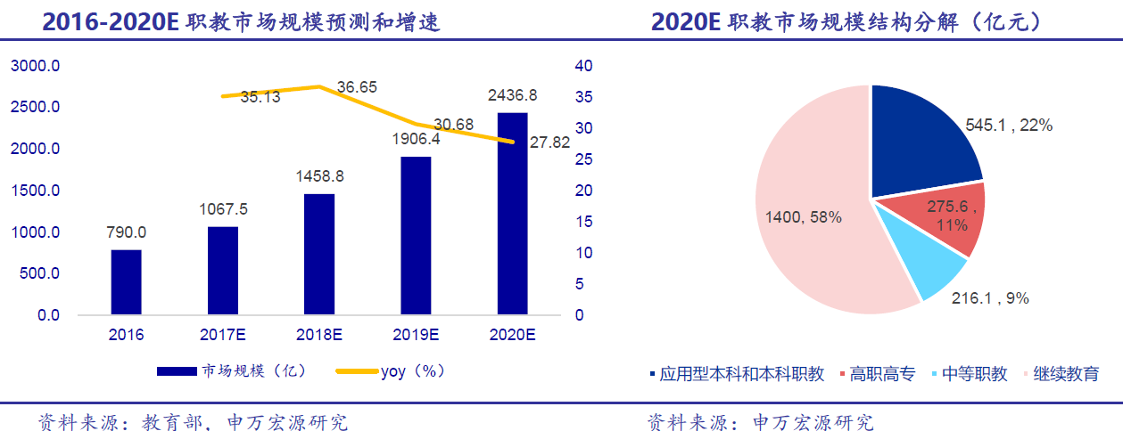 申万宏源预计,职教2020年市场规模将达到2436.8亿元,CAGR(2016年~2020年)32.52%,其中职业培训占比57.45%,应用型本科和本科职教占比22.37%,高职高专占比11.31%,中职占比8.87%。