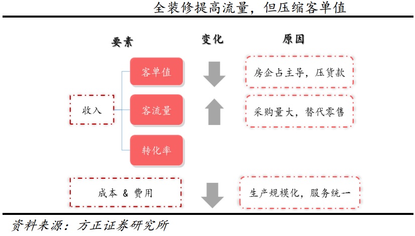 全装修政策加速落地对家居行业产生重大影响。方正证券指出,从宏观来看,全装修主要影响硬装环节,各地政策要求全面覆盖硬装,而软装需求更为个性化。此外,地产商选择全装修供应商时更青睐龙头家居品牌,与龙头合作衬托项目品质,提升档次;而且龙头供应链管理出色,资金宽裕、产能充足。与此同时,全装修是未来家居企业一大流量入口,可消化富余产能;但是全装修压缩平均售价,盈利空间小,回款周期长,增加企业现金流负担,不过企业筛选优质项目可缓解上述限制。