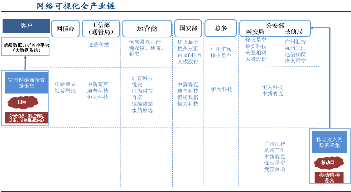 流量数据的监控,又称为网络可视化,可类比为虚拟世界的摄像头。网络可可视化产业链自下而上为:需求部门、后端数据分析监控平台、前端数据采集设备。需求部门主要为政府核心四大部委(网信办、工信部、国安和公安)以及总参和运营商。后端数据分析监控平台主要为11家大数据与系统集成公司,前端数据采集为6家前端数据采集设备商。