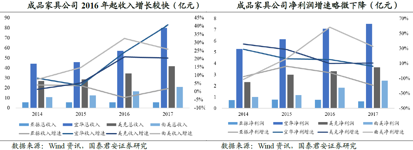国泰君安指出,成品家具公司收入总体自2016年起实现加速增长。自2016年起,成品家具公司收入增速均在20%左右,曲美家居更是超过30%,其主要原因为渠道扩张、价格带下沉以及从部分企业从成品到定制的延伸。从净利润的角度分析,由于单位成本的上升,成品家具公司净利润增速略微下降,其中,美克家居由于成本和费用控制实现平稳增长,同时曲美家居也由于费用率的降低,其2017年净利润增速超过收入增速。