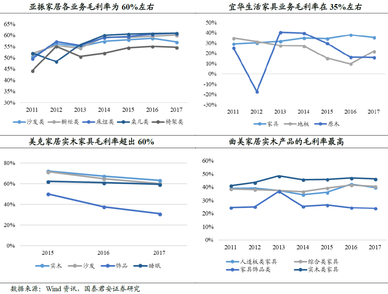 实木家具毛利率较高,中高端实木家具产品毛利率达60%。在各家成品家具上市公司的细分业务中,亚振家居以实木和综合家具为主,各产品毛利率接近,均为60%左右。同样美克家居的实木家具毛利率也达到63%。相比于实木家具,人造板和综合家具的毛利率较低为40%。其中一方面原因在于实木的毛利率较高,另一方面也由于各家公司直营收入占比较高。