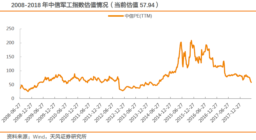 从估值方面看,军工板块处于历史低位。纵向对比,军工板块的估值水平处于历史低位,横向对比,相当部分军工标的中2018年预期PE已与大多数行业板块相当,东吴证券认为,考虑到军工主机厂以及系统级生产商的行业龙头地位、稀缺性、业绩成长的确定性、体外资产等因素,部分主流军工标的目前估值已处于合理较低水平,同时股价处于低位且具有成长性的民参军公司也具备配置价值。