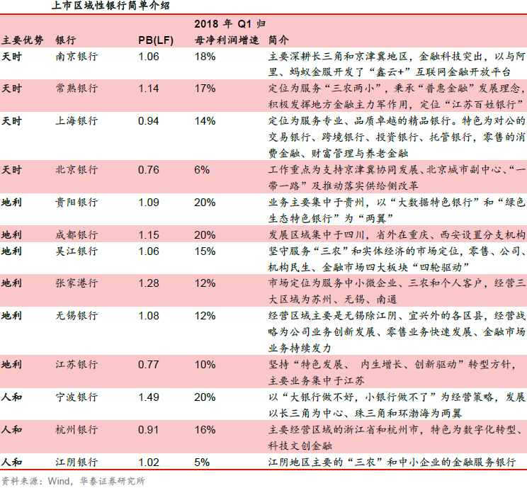 华泰证券认为区域性银行目前具有较大的投资机会,主要的投资逻辑有四:①区域性银行的监管定位是服务地方经济,当前区域经济的加速发展将对本地银行形成直接受益;②小微金融业务大有可为,国家对小微企业的扶持政策频密,给区域性银行提供了发展良机;③银行业处于整体转型阶段,区域性银行体量较小,有快速转型的条件;④目前区域性银行估值处于较低水平,近期区域性银行新股上市节奏明显加快(2018年1~5月已过会3家,2017年全年仅1家),板块估值有望得到新股的提振。