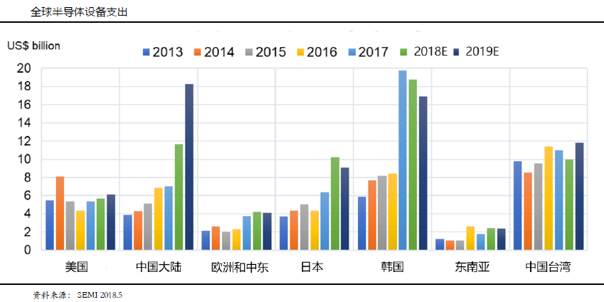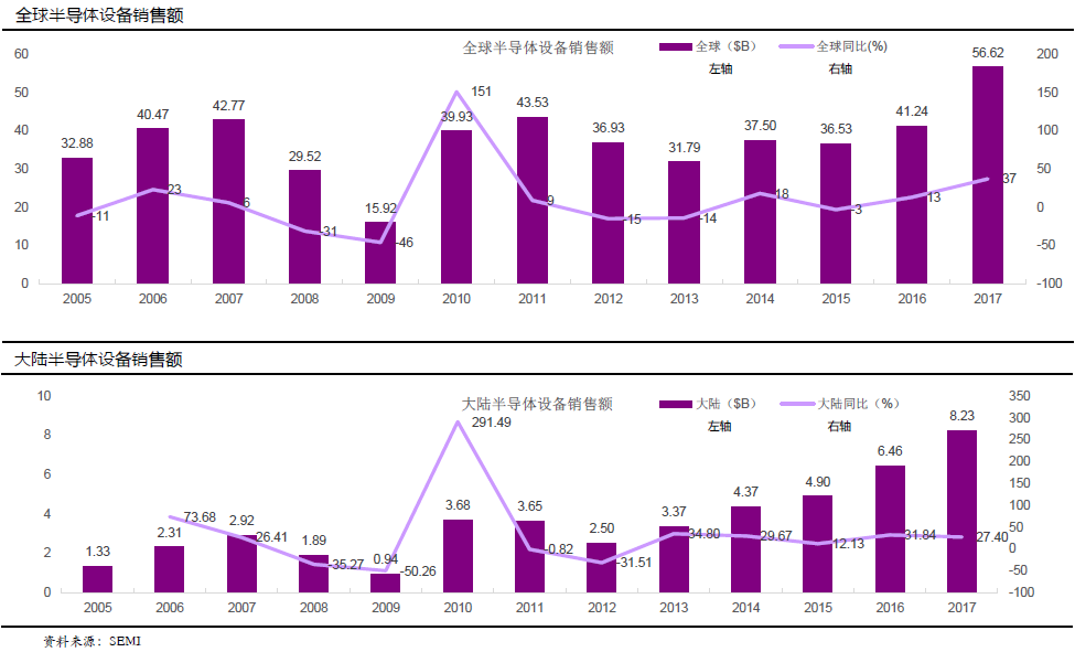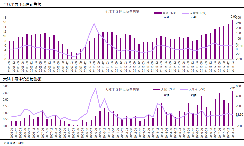 光大证券指出,受益于半导体行业高景气,全球及大陆半导体设备行业发展迅速。2017年全球半导体设备市场规模达566亿美元,中国大陆达82.3亿美元。
