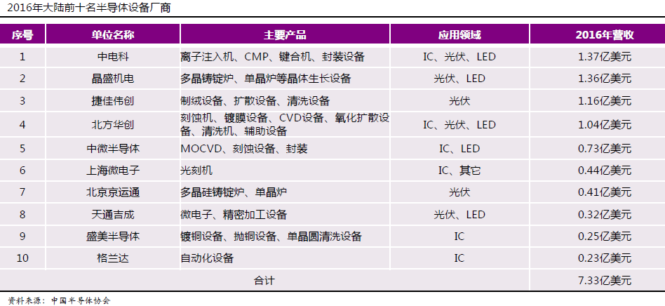 光大证券指出,全球半导体设备行业高度集中,美日荷三国占据主要份额。全球半导体前道制造设备市场高度集中,呈现寡头垄断格局。2016年大陆集成电路设备市场规模约为64.6亿美元,而大陆前十名的半导体设备厂商营收总额才7.33亿美元,自给率非常低,进口替代空间巨大。