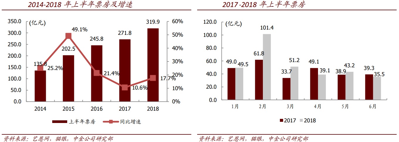中金公司指出,2018年上半年电影市场实现稳健增长,国产片票房超过半壁江山。2018年上半年电影市场票房累计319.9亿元,较去年同期增长17.7%,其中,国产影片贡献票房约189.7亿元,同比大幅增长80.1%,占上半年总票房的59.2%,成为票房贡献主力。票房TOP10影片中,2018年上半年国产片占据6个席位。观影人次整体呈上升趋势,2018年上半年累计观影人次9.0亿人,较去年同期增长15.3%。