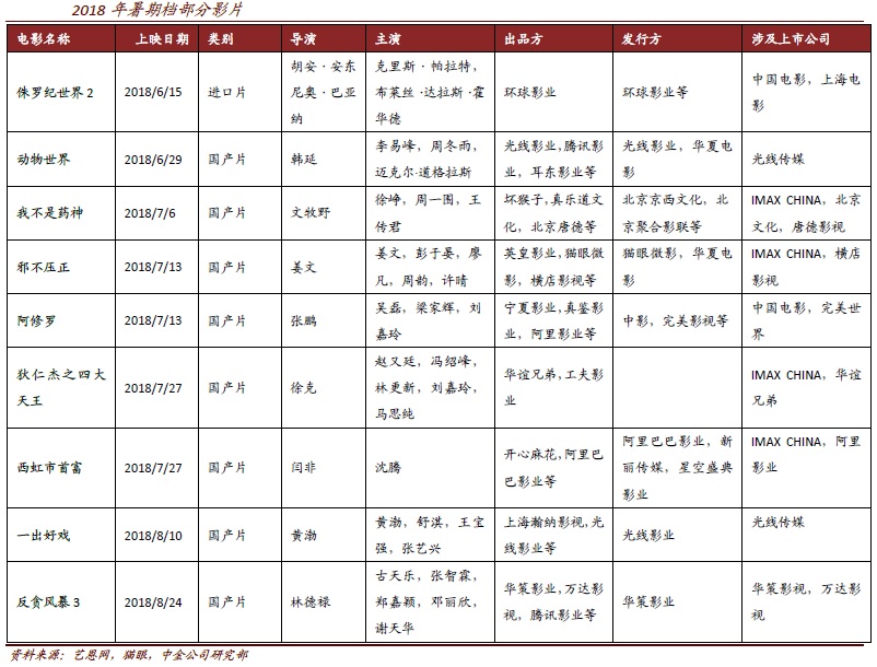 与此同时,中金公司发现,2018年暑期档优质内容储备充足,爆款作品有望涌现。2018年目前已定档的暑期档影片总体内容质量很高,主要包括三类:导演凭借以往出色作品或自身舆论热度引起讨论的影片、众星云集的影片和IP改编或系列影片之一的影片。预期热度较高的影片如《动物世界》、《邪不压正》、《我不是药神》、《西虹市首富》、《狄仁杰之四大天王》、《一出好戏》有望取得较好的票房表现。