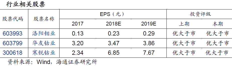 海通证券认为,上半年的价格下行主要和产业去库存相关,当前产业库存水平相较2017年更为健康。而下半年,补贴新政之后,随着中下游对于高里程车型的产业磨合后,需求环比会逐渐加速;供给端,刚果金矿业法的执行发酵,会使得矿产寡头效应更为凸显。因此2017年下半年:供给降+需求增。尤其是产业库存水平下降,很容易引发供需错配。建议关注龙头标的:洛阳钼业(603993.SH)、华友钴业(603799.SH)、寒锐钴业(300618.SZ)、盛屯矿业(600711.SH)。