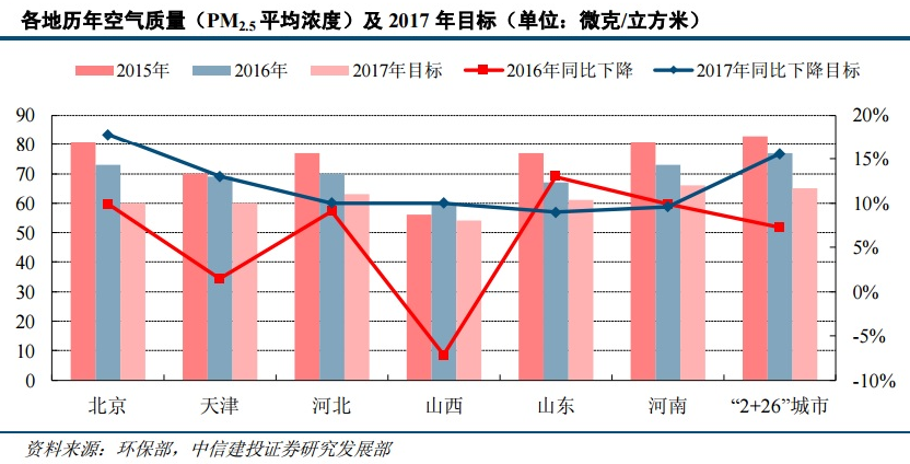 光大证券指出,与2013年出台的《大气污染防治行动计划》相比,《行动计划》在目标指标的设定上有了全面提高。标准方面,“大气十条”中要求在5年时间里PM浓度下降10%以上,而《行动计划》则要求2.5在5年时间里,未达标地级及以上城市PM浓度下降18%以上,同时新增2.5了二氧化硫和氮氧化物排放总量下降15%的针对性要求;《行动计划》同时量化了优良天数的提升目标,要求地级及以上城市空气质量优良天数比率在2020年达到80%,重污染及以上污染天数比率比2015年下降25%以上。