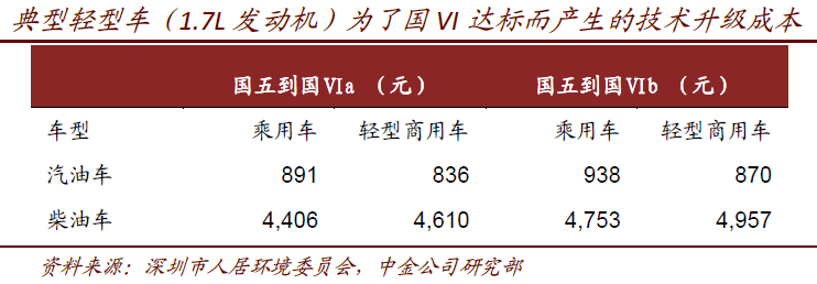 中金公司预计轻型柴油商用车从国五升级到国六的达标成本超过4600元,主流柴油系统供应商的开发工作目前严重滞后,而2017年柴油车在轻客和轻卡两个市场的占比分别为71.5%和78.9%,因此预计短期内在深圳等率先推广国六的省市将出现无国六柴油车可卖、新能源汽车占比大幅提升的局面,而中长期看轻型柴油机成本的提升,将会导致柴油车在轻型商用车的占比下降,同时轻型柴油机市场出现整合。