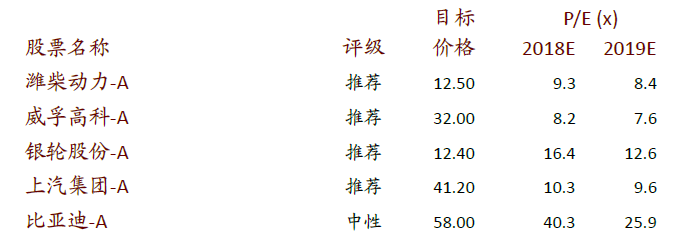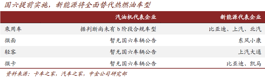 中金公司认为,排放升级相当于全社会向汽车行业购买清洁能源技术,并通过技术和需求升级倒逼商用车行业整合,利好潍柴动力(000338.SZ)、威孚高科(000581.SZ)、银轮股份(002126.SZ)等相关重型柴油机企业及其供应商,也利好上汽集团(600104.SH)、比亚迪(002594.SZ)等电动轻型车企业。