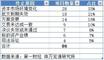 据不完全统计和归类来看,今年上半年已有86家上市公司的定增项目终止。其中,因 “资本市场环境变化”而主动终止的有28家,占到33%,比重最高。因批文到期失效而被动终止的有18家,占比达到21%。此外,因方案变更、交易条件未达到一致的分别有14家、9家,占比分别在16%、10%。