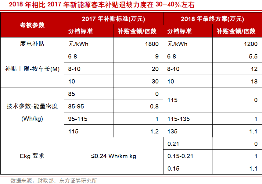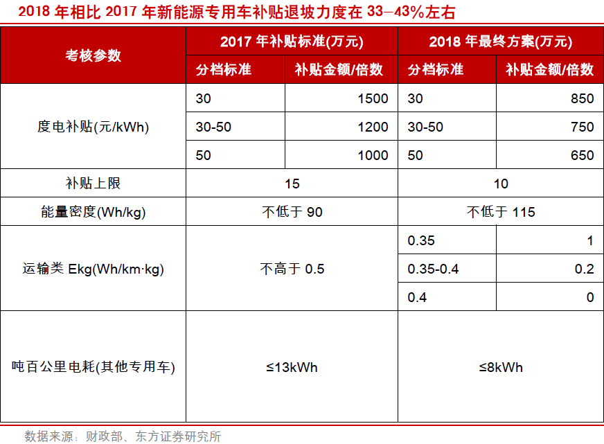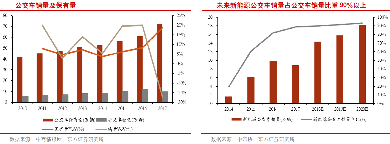 《行动计划》提出在未来三年加快推进新能源公交车,到2020年底,直辖市、省会城市、计划单列市建成区公交车将全面更换成新能源汽车。2017年新能源公交车销量8.9万台,同比下降10%,主要原因在于2016年快速扩张透支一部分2017年的需求,但东方证券认为未来三年公交车新能源化将加速稳步向前推进。