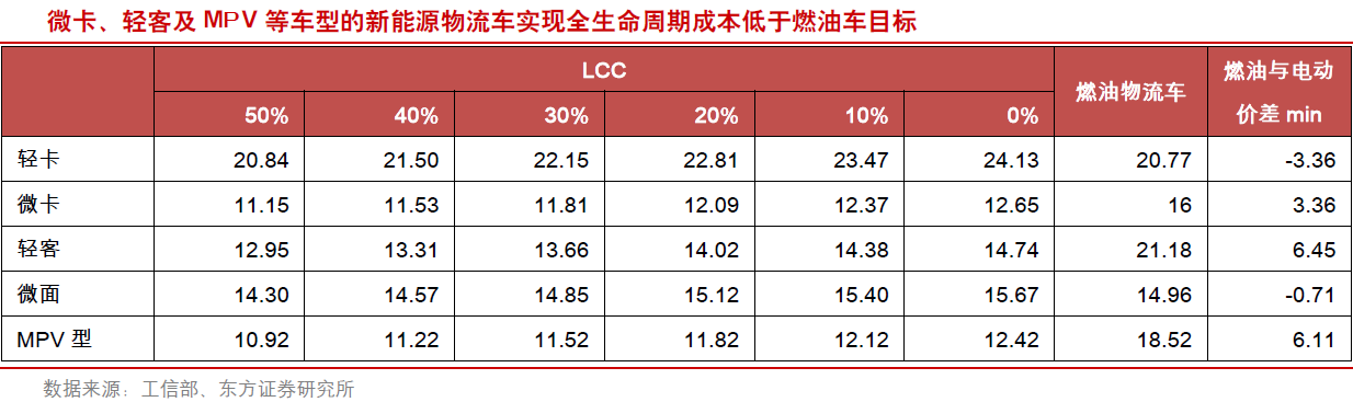 2017年我国新能源物流车产量达14万辆,同比增长150%,主要原因在于当年国家及地方补贴力度大,而2018年中央补贴标准同比下降33~43%,使得市场对新能源物流车发展抱有怀疑态度。但东方证券认为未来新能源物流车仍将实现强劲发展,首先据测算,在2018年中央补贴条件下,即使没有地方补贴,微卡、轻客及MPV等车型的新能源物流车已经实现全生命周期成本低于燃油车的目标,其经济性已经得到凸显;其次,在《行动计划》等政策指引下,非补贴性政策将逐步落地推动新能源物流车市场发展。估算到2020年全国城市物流车年销量将接近300万辆,其中新能源物流车占比有望在10%以上,超过30万辆。