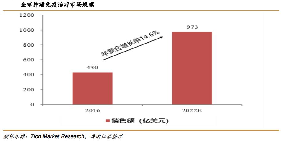 肿瘤免疫疗法目前已成为抗肿瘤药物市场的中坚力量,全球市场规模预计将会从2016年的430亿美元增长到2022年的近千亿美元,占据抗肿瘤药物市场超过一半的份额,年复合增长率达到14.6%。