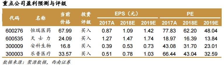 西南证券建议参考临床研究成果及产业化能力,重点推荐关注恒瑞医药(600276.SH)、天士力(600535.SH)、安科生物(300009.SZ)、乐普医疗(300003.SZ)。