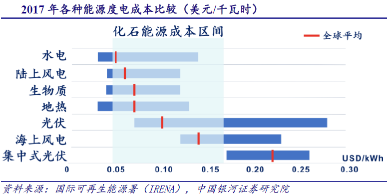 银河证券指出,得益于市场机制的引入,欧洲风电发展进入新阶段,截止至2017年底,英国、德国、丹麦等国已采取竞拍定价的模式决定风电上网电价。根据全球风能理事会报告,在摩洛哥、印度、墨西哥和加拿大,2017年风电价格在0.03美元/kwh左右,其中墨西哥最新的招标价格更是达到0.02美元/kwh。此前德国第四轮陆上风电项目平均投标价为0.0462美元/kwh。同时,德国海上风电项目招标中出现了全球首个“无需补贴”的海上风电项目。全球陆上和海上风电招标价格日益下降,风电的度电成本越来越具有竞争力。
